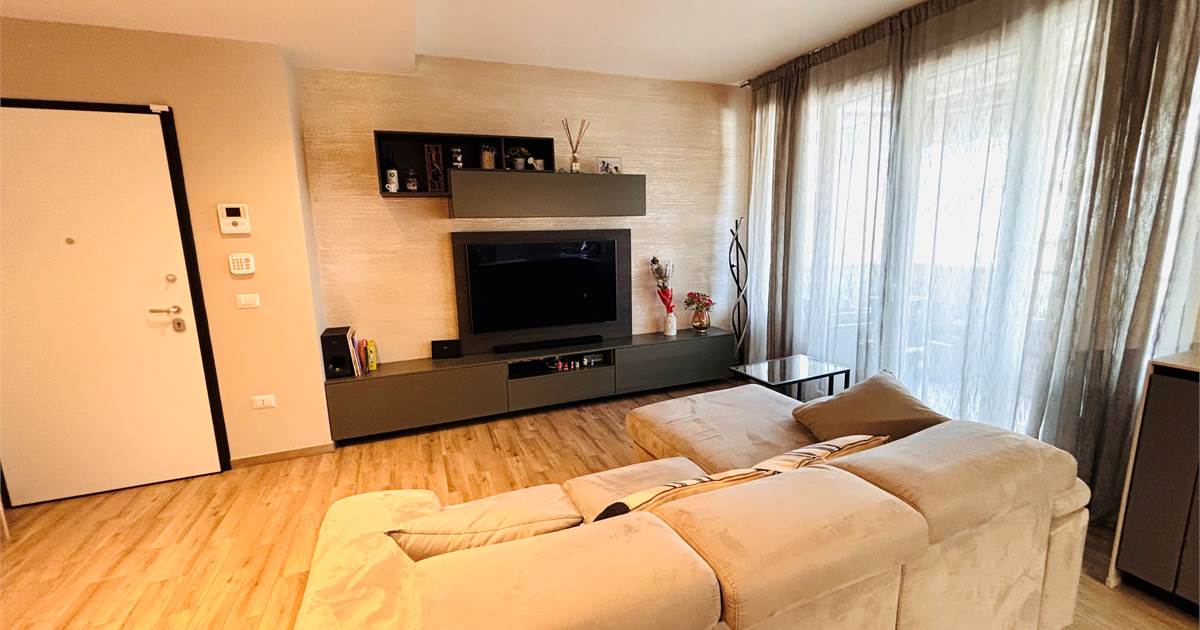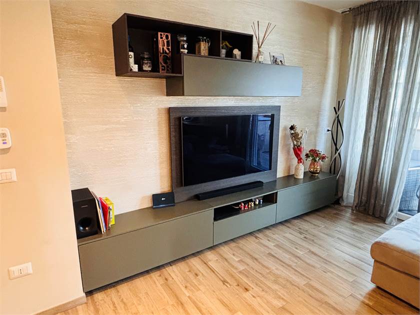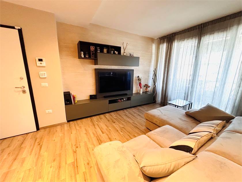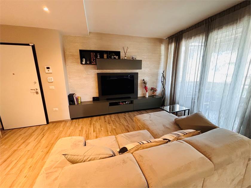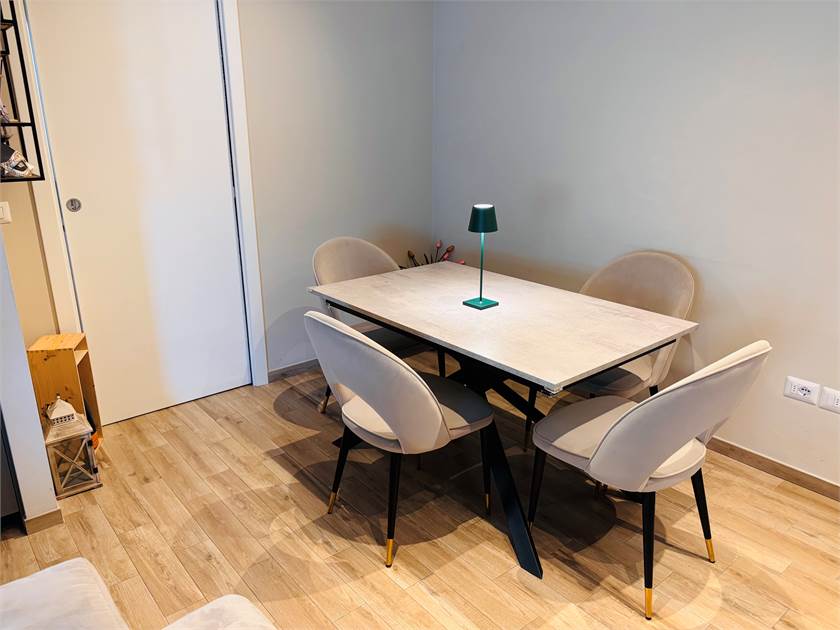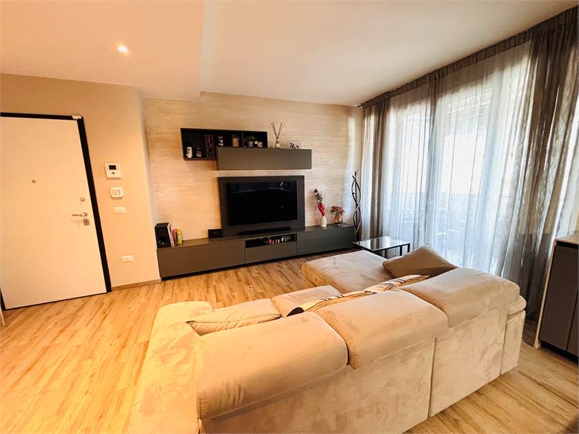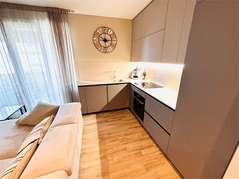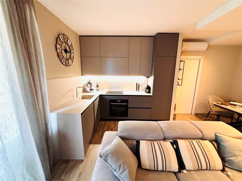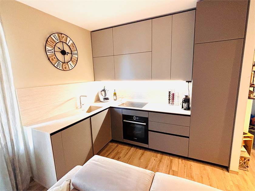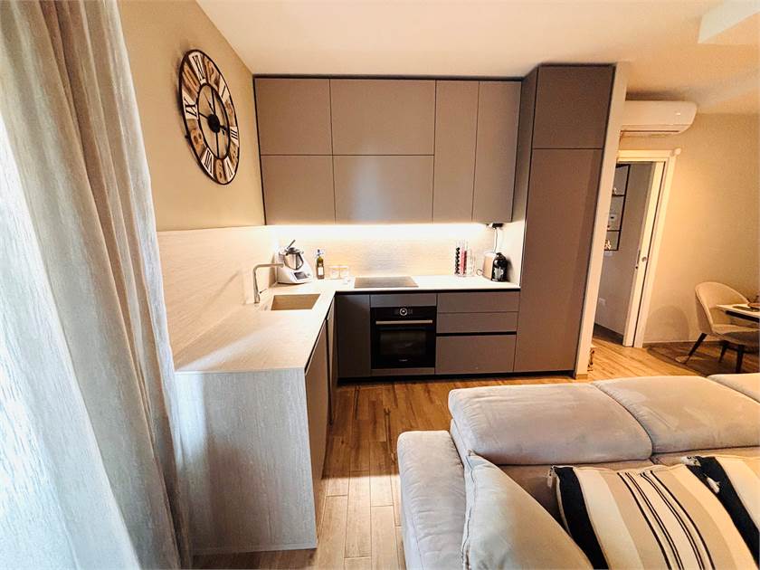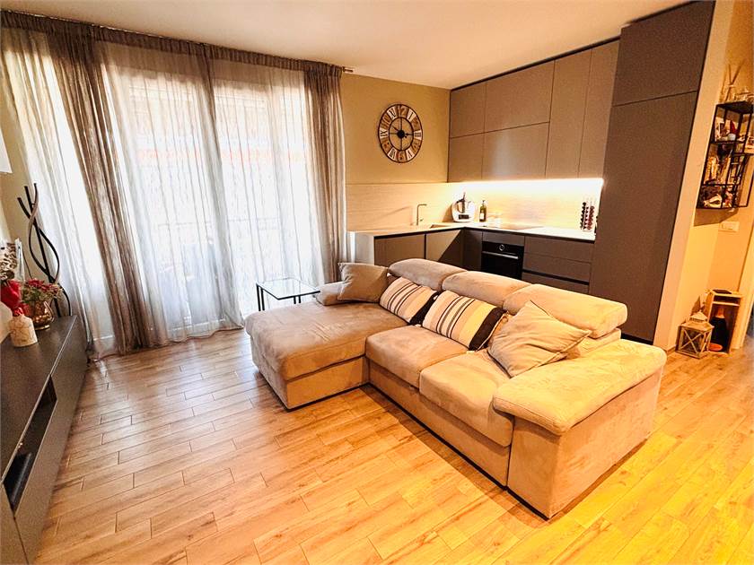 Varcata la soglia, verrai accolto da un'ampia zona living inondata di luce naturale, dove la cucina a vista si integra perfettamente in un ambiente conviviale e moderno.