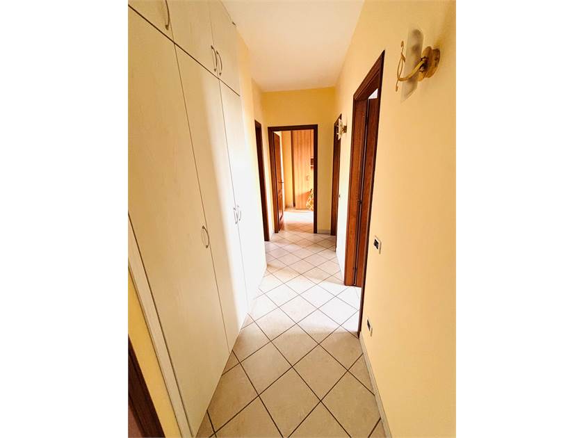 La zona giorno è composta da un ampio soggiorno con camino, perfetto per l'atmosfera invernale, e una cucina in muratura funzionale. Due lunghi terrazzi corrono ai lati dell'appartamento, offrendo un piacevole sfogo esterno a tutti gli ambienti. La zona notte comprende tre camere da letto, un pratico disimpegno con armadio a muro e due bagni.